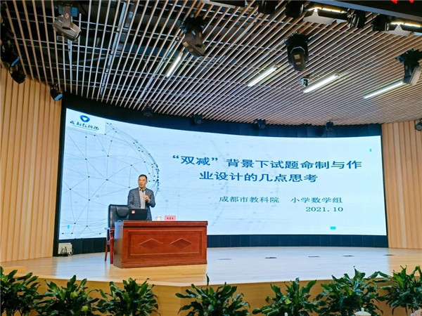 最后,成都市教育科学研究院基础教育研究室负责人、小学数学组张碧荣老师带来讲座《“双减”背景下试题命制与作业设计的几点思考》,张老师提出试卷命制的四个重要指标,通过中国传统成绩与国外成绩报告方式的对比,提出教师应注重培养学生的数学核心能力,通过数学问题的提出,进行数学表征与变换、数学推理与论证、数学问题解决,最后通过数学交流进行数学建模。张老师通过对不同的作业设计的案例分析提出数学作业的设计应根据学生的认知要求,注重考查学生的学科核心能力和学科核心素养,不仅要注重基础类知识的练习,更应适当增加综合性、开放性、应用性和探究性的练习。