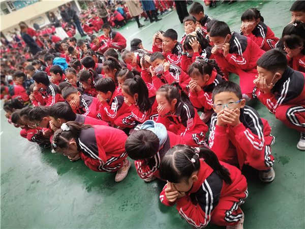 随着警报响起,正、副班主任老师迅速组织学生疏散逃生。各班按照既定路线,猫着腰,用手、袖口等捂着口鼻,按两列纵队迅速而有序地进行紧急疏散。