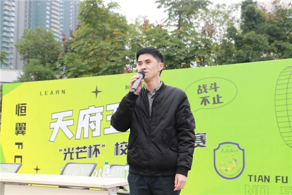 本次足球联赛开幕式,邀请到了天府五小校长周鹏飞、副校长胡睿、教师代表以及家长代表。开幕式上,周鹏飞校长进行致辞。