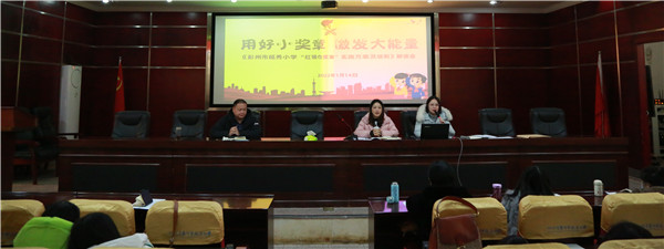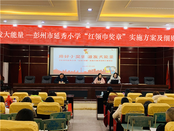 为有序稳妥、全面快速地推进“红领巾奖章”的实施工作,1月14日下午,彭州市延秀小学在总部多功能室专门召开了《“红领巾奖章”实施方案及细则》解读会。德育副校长高雪霞、德育副主任黄强、少先队总辅导员陈莉以及全体大、中队辅导员参加了此次会议。