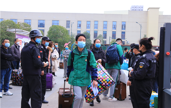 2月17日早上,在成都市实验外国语学校五龙山校区门口,学生们身穿校服、戴着口罩有序排队,进行体温监测后陆续入校。校园内干净整洁,教学楼、教室等区域还张贴了醒目的疫情防控宣传标语。
