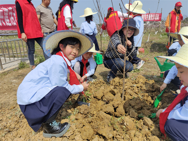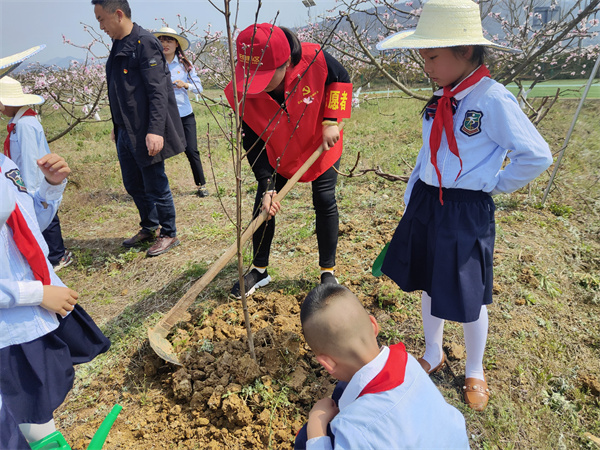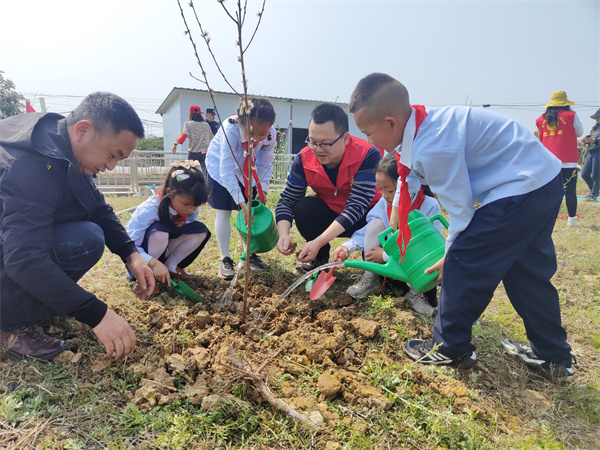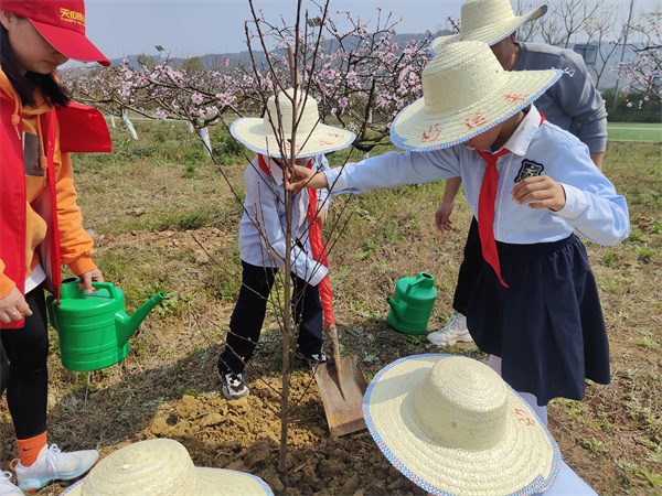 同学们热情高涨,平常连锄头都没有摸过的他们,此刻当起了“园艺工程师”。他们分工合作,有的挖坑,有的扶树苗,有的浇水,还有的培土……烈日下,该校学子干得热火朝天,场面温馨快乐。在二郎村党支部志愿者的帮助下,在他们的辛勤劳动下,一棵棵桃树挺立在沃土上。