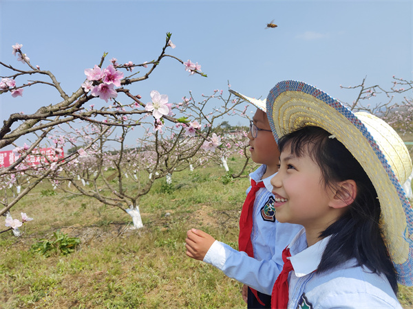太平小学少先队员们迎着烈日,拿着工具,在教师志愿者的带领下,徒步来到该校劳动实践基地。