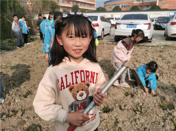 各班领取了种植苗,在老师、家长的指导下除草、平整土地、清理结块泥土,小心翼翼地把幼苗埋进坑里,培土、浇水、悉心呵护,期待着幼苗悄悄长大。