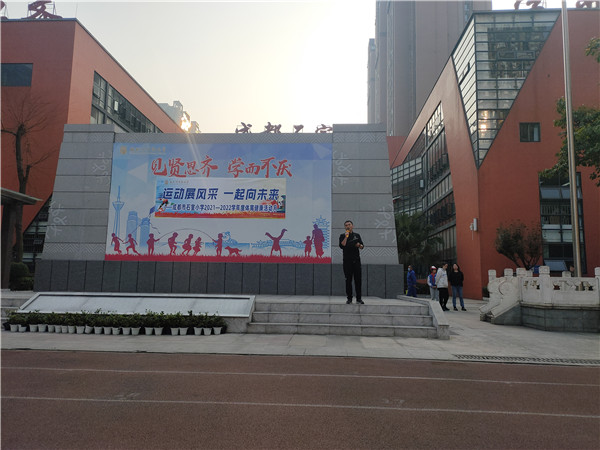 体育教研组长王威力老师上台发言,他表示:“我们今天的幸福生活源于祖国的强大,而祖国未来的更加强大还需要我们青少年一代拥有健康的灵魂和强健的体魄。”同时王老师对石室小学体育活动月的活动安排进行了大致的介绍。最后宣布体育活动月正式开幕启动。