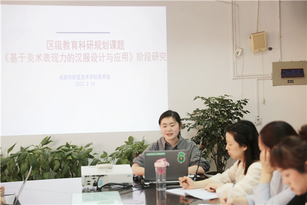 科研是一件充满挑战、令人幸福的事情,在成都市群星美术学校大力推进科研促教的环境下,学校美术课题组课题《基于美术表现力的汉服设计与应用》通过区级立项后,顺利开展研究。2022年3月14日下午,学校会议室召开了课题阶段研究交流会,成都市群星美术学校美术组、成都市玉林小学美术组全体美术教师现场参与了本次活动。