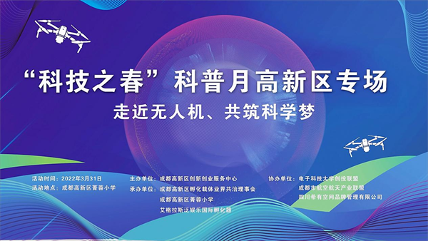 3月31日,正值成都市第二十六届“科技之春”科普活动月之际,由成都高新区创新创业服务中心主办,成都高新区孵化载体业界共治理事会、成都高新区菁蓉小学、艾格拉斯泛娱乐国际孵化器联合承办,电子科大创投联盟、成都市航空航天产业联盟、四川希有空间品牌管理有限公司共同协办的“走近无人机、共筑科学梦”无人机知识青少年科普主题活动在成都高新区菁蓉小学圆满落幕。