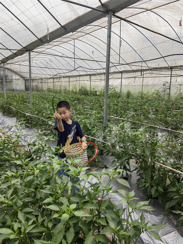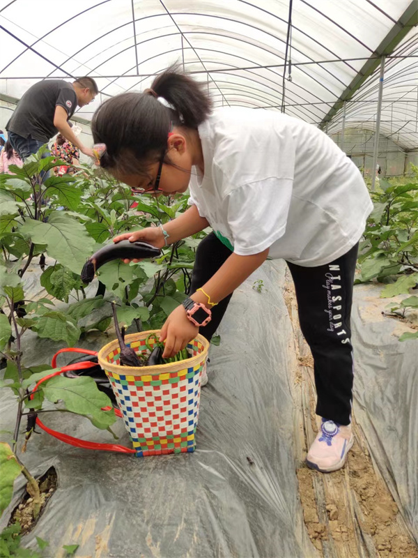 同学们为见到青椒和茄子生长在秧苗上,橄榄豆生长在藤蔓上惊喜不已。尽管大棚里高温难耐,但同学们通过自己的劳动采摘了满背篓的蔬菜,感受到了丰收的喜悦。