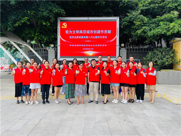 8月18日,成都近40°C的高温下,高新区菁蓉小学37名党员教师顶着烈日,在学校周围劝导车辆文明停放、给草木修枝、打扫路面清洁……汗水打湿了老师们的头发,从脸颊滴落,衣背也早已湿透,但为了文明典范城市的创建,老师们不惧炎热,不言辛苦。