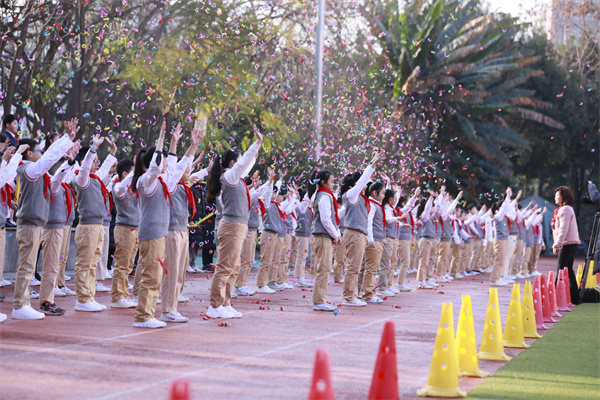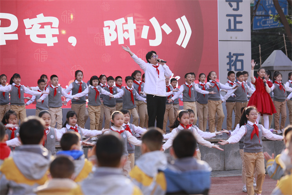 “早安,中国!早安,附小!”全校师生整齐划一的祝福声传遍校园每个角落,惊飞了树上的小鸟。十六支礼炮的绚烂礼赞和轰鸣声响彻云霄,也在最美的春天里吹响了新学期奋进的号角!