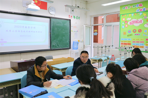 信息技术组全体教师在六年级五班开展了教研活动。首先,周俊副校长从信息技术教学工作准备、信息技术与其它学科融合、信息技术与五育并举融合以及本学期信息技术学科赛达标的开展要求四个方面进行详细的分工和部署。