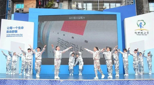 五(1)中队用歌舞书写壮志,梦想指引着前进的方向。