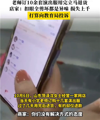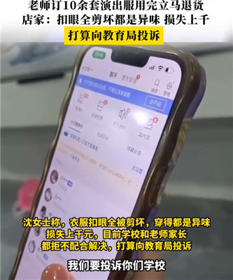 10月6日,山东菏泽。沈女士经营一家网店,当天有小学老师订购十几套演出服,过了几天用完后退货,有的却仅退款。沈女士称,衣服扣眼全被剪坏,穿的都是异味,损失上千元,目前学校和老师家长都拒不配合解决,打算向教育局投诉。