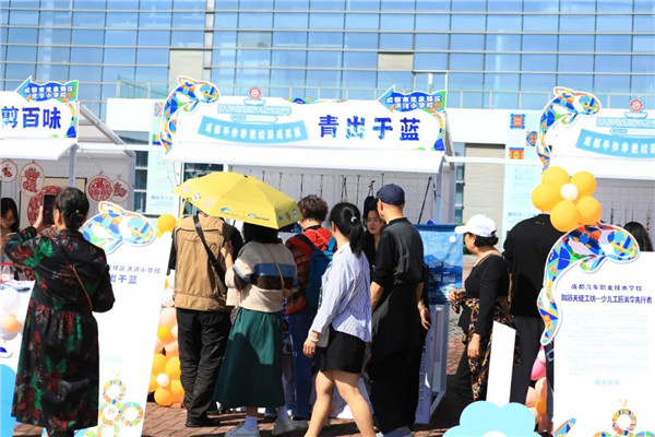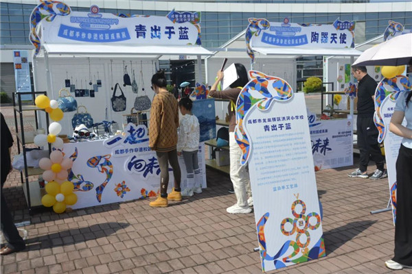 在“一起向未来”成都非遗校园成果展示区,学校“青出于蓝”的展台门庭若市,络绎不绝,蓝白素雅与灵性吸引着来自五湖四海的客人。