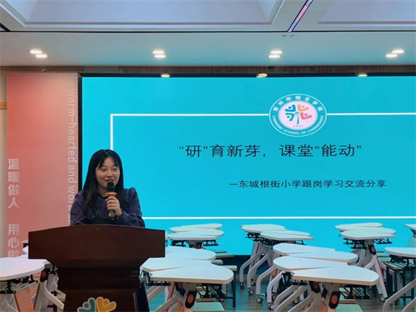 从“心有所得”到“言之所获" 10月23日晚,城北学校在比邻讲堂开展了以“品学习、共分享、促成长”为主题的东城根街小学跟岗学习分享会。 李鲜老师代表语文组从“望、闻、问、切”四方面向老师们分享了自己的所学所得。尤畅老师代表数学组从学集体备课、问学业质量、思“我们”三方面分享了自己的学习感悟。金欣怡老师以“享教研、共成长”为主题,从课前、课中、课后三个方面分享了自己的所见所感。