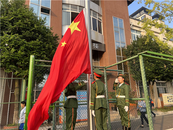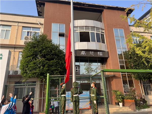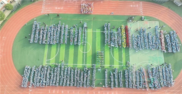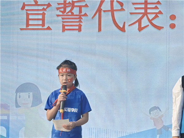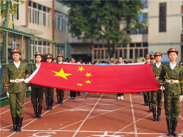 党总支书记、校长文家富宣布成都市温江区实验学校第十八届体育节暨田径运动会开幕并鸣枪,彩旗队快速就位,整个操场彩旗飘扬。