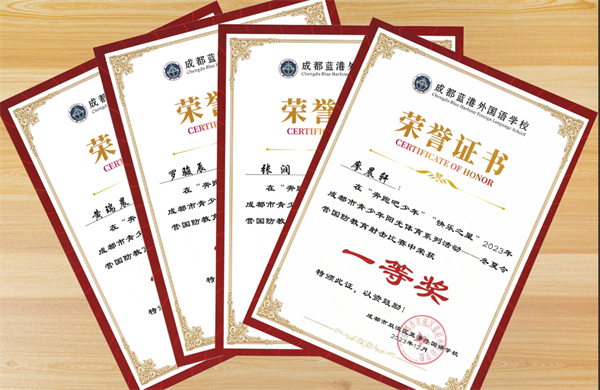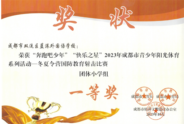 近日,由成都市体育局、成都市教育局、成都市精神文明建设办公室联合举办的“奔跑吧少年”“快乐之星”2023年成都市青少年阳光体育系列活动中,成都蓝港外国语学校张润、罗骏辰、廖晨轩、黄瑞晨同学代表学校参加了射击比赛,获得了比赛团体小学组一等奖。