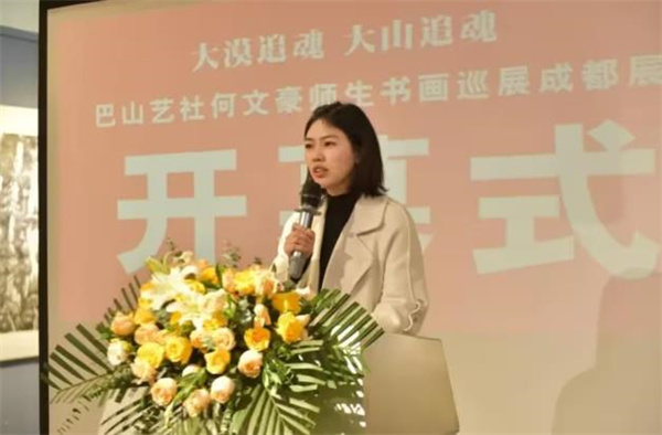 2023年12月23日下午两点,由四川大学书法研究所、新疆建设兵团美术家协会、成都市书法家协会、达州市通川区文学艺术界联合会主办,成都诗婢家美术馆、巴山艺社、石河子大学文艺学院、四川文理学院美术学院、达州市美术家协会、万源市书法家协会承办,成都财智光华培训学校、成都川音美文化艺术培训学校、山西晋中爱家装饰工程有限公司协办的“大漠追魂、大山追魂——巴山艺社何文豪师生书画巡展”在成都诗婢家美术馆开幕。
