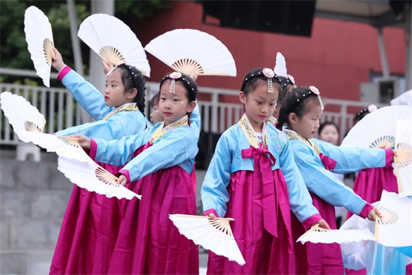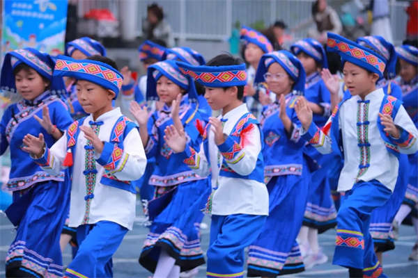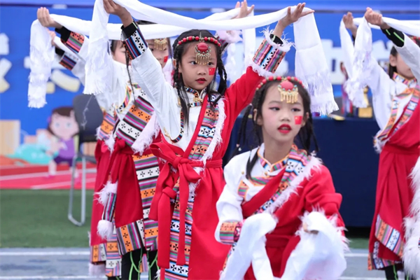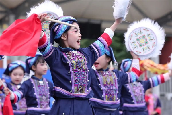 孩子们在这一分钟的展示中个个身姿轻盈、手脚灵活、默契十足,观众席上掌声不断、沉浸其中,这似乎是一场在“祖国”这本大书中的穿梭,各民族文化大放异彩。