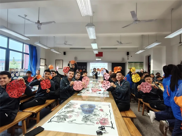来到学校种植基地前,一幅幅生动有趣的足球主题剪纸和绘画作品映入眼帘,让人赞叹不已。而接下来的综合楼二楼美术教室之行,更是让吉尔吉斯斯坦的朋友们亲身体验了一把中国传统剪纸艺术的魅力,亲手创作,与授课老师温馨合影,留下了难忘的记忆。