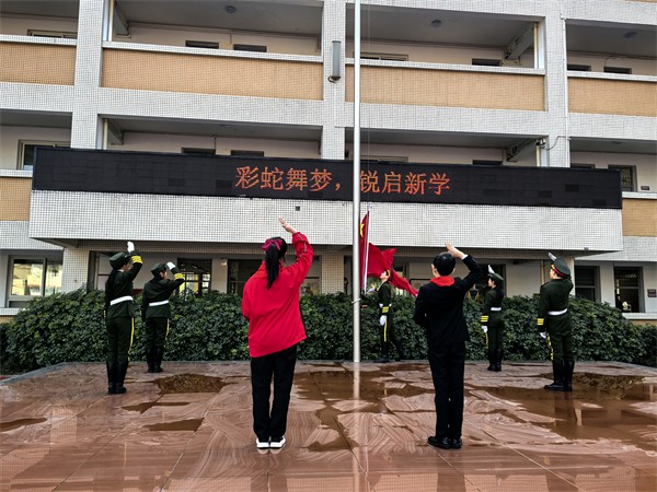 在典礼上,随着主持人宣布,全场师生肃立,出旗并奏乐。随后,升国旗、奏唱国歌,庄严的仪式让每一位师生都感受到了新学期的庄重与希望。