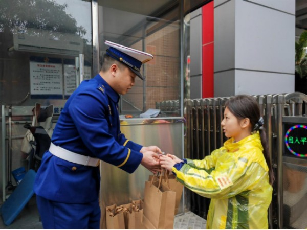5日清晨8时,由教师、家长志愿者和少先队员组成的工作小组,在营养师指导下完成银耳羹的标准化熬制。学生们全程参与食材拣选、称量配比、熬煮封装等12道工序,将劳动教育融入志愿服务实践。上午10时,身着橙色马甲的“学雷锋小分队”分赴五块石街道各社区站点,为环卫工人、社区民警、消防员及快递员送上定制餐品。
