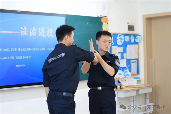 课程的第二部分,由天府新区检察院司法警察大队的王凤丹、陈卓、孙小鹏三位警官,带来了一场实用有趣的自卫术演示和实操教学。孩子们认真模仿、积极参与,在轻松的氛围中掌握了基本的自我防护技能,让法治教育不仅入脑,更融入行动。