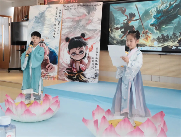 最令人期待的环节当属同学们的精彩展示,从一年级到六年级,各个班级的同学们各显神通,用英语演绎出一个个生动的哪吒故事。