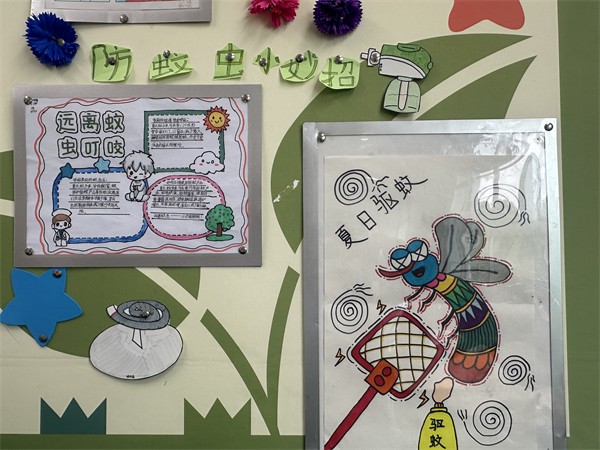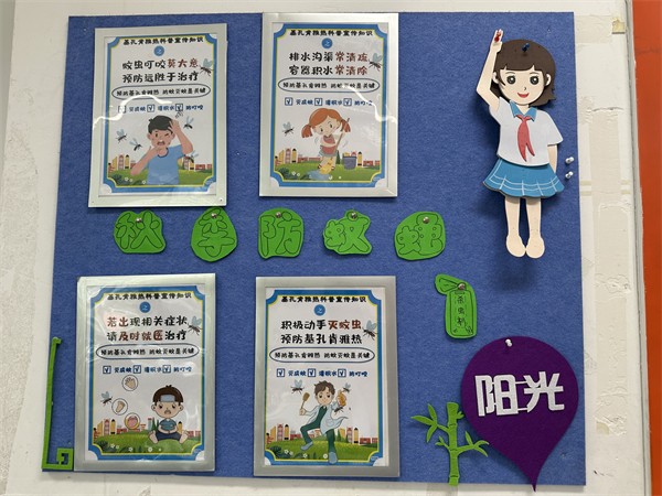教室后墙黑板分为“欢度国庆”与“秋季防蚊蝇,健康伴我行”两大板块,融家国情怀与生活实用于一体。“欢度国庆”区域布满学生的书画作品,笔触间尽显对祖国山河与成就的自豪,字画中寄托对未来的美好向往;而防蚊蝇健康小贴士则生动普及卫生知识,引导学生勤通风、勤洗手,营造安全整洁的学习环境。