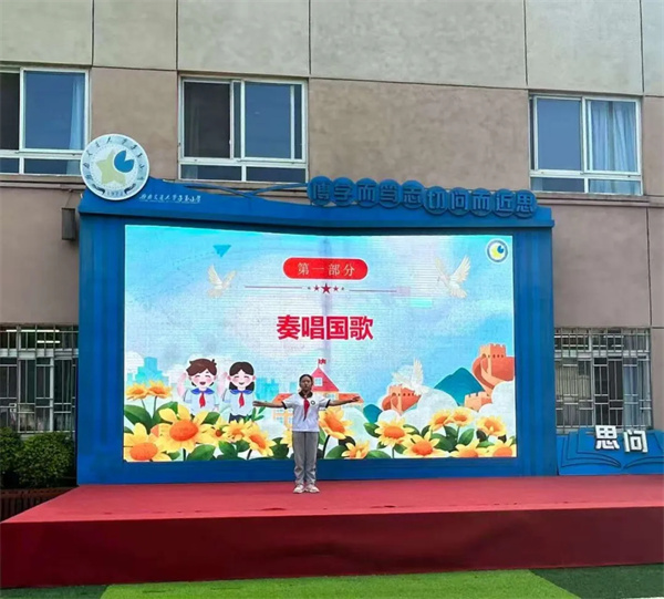 仪式在激昂的国歌声中拉开帷幕,全体师生肃立高唱,表达对祖国的无限热爱。随后,少先队队旗在鼓号声中庄严入场,队员们行队礼,新同学行注目礼,目光中充满敬仰。全体同学齐声高唱《中国少年先锋队队歌》,用铿锵旋律展现新时代少年的蓬勃朝气。