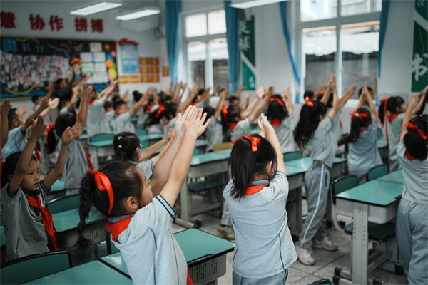 近日,每当课间时分,穿行于成都市温江区和盛小学校的教学楼,你会听到阵阵欢快的音乐,看到孩子们在教室里舒展身体、律动欢笑的身影。这热火朝天的景象,正是该校为保障学生每日运动量,科学创编并全面推广的“室内阳光操”所带来的活力新风尚。