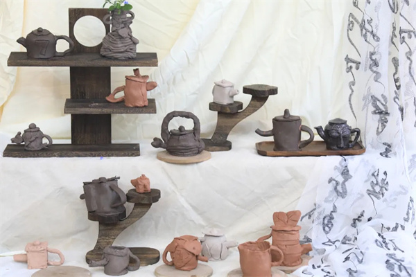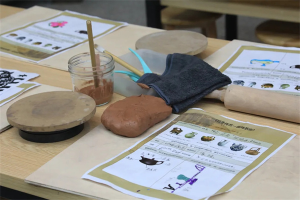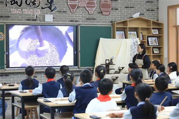 课堂上,贺晓容以“欣赏—探艺—实践”为主线,借《紫砂泥炼制》视频、泥条盘筑与泥板成型教学及吉祥图案茶壶案例,逐步引导学生掌握黏土造型技法。