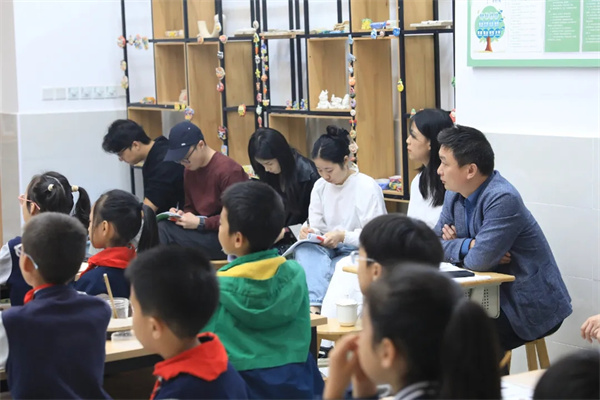 课后,戴科彬与美岸小学美术组全体教师研讨贺晓容的课堂。戴科彬肯定其教学亮点:AI设计与黏土实践衔接自然,“工匠精神”融入文化溯源有深度,分层目标贴合学生差异。