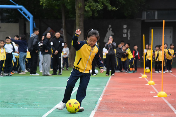 “原地拍球”场上,一年级萌娃稳控篮球,节奏分明;“篮球行进间上篮”中,六年级步伐矫健,出手精准;“足球运球绕杆”与“排球垫球”则分别展现了二年级与四年级同学们的灵巧稳健;实心球在空中划出抛物线,同学们立定跳远腾跃如雁。每一项比赛都凝聚着同学们的汗水与拼搏。