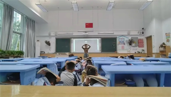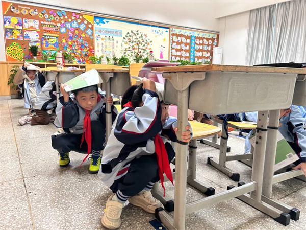 上午9:00,尖锐的广播警报声骤然响起,持续60秒,全体师生迅速进入紧急避险状态。学生们反应敏捷,立即躲至课桌下或旁边,迅速用书本、书包护住头部,保持下蹲姿势,动作规范有序。