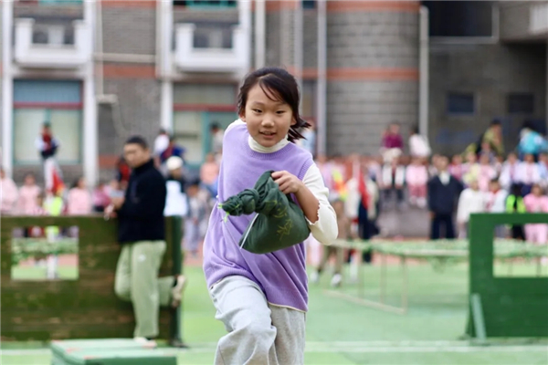 低年级的小选手们依次完成绕过标志杆、匍匐穿过地桩网、弯腰钻过障碍墙和抱沙袋过独木桥的任务,模拟军用物资运输的过程中,稚嫩的肩膀扛起了“责任”的种子。