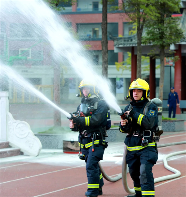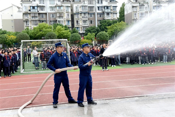 此时,操场上就迎来了特殊的“客人”——双流区航鹰路消防救援站的消防员叔叔。他们带来了“神秘装备”:沉甸甸的消防服、长长的水带、威武的消防车,看得同学们眼睛发亮。