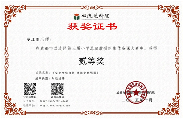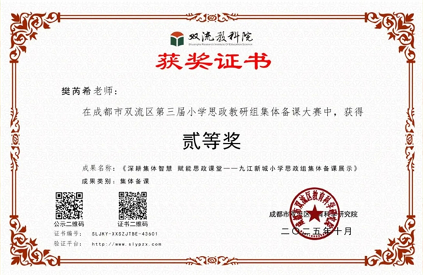 近日,从成都市双流区教育科学研究院传来捷报:在“第三届小学思政教研组集体备课大赛”与“第四届小学思政微课大赛”两项区级重磅赛事中,成都市双流区九江新城小学道德与法治备课组凭借扎实的教研功底、默契的团队协作,一路过关斩将,斩获多项殊荣,为学校思政教育事业添上了浓墨重彩的一笔!
