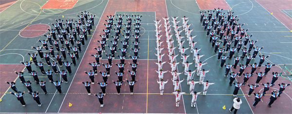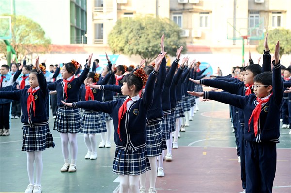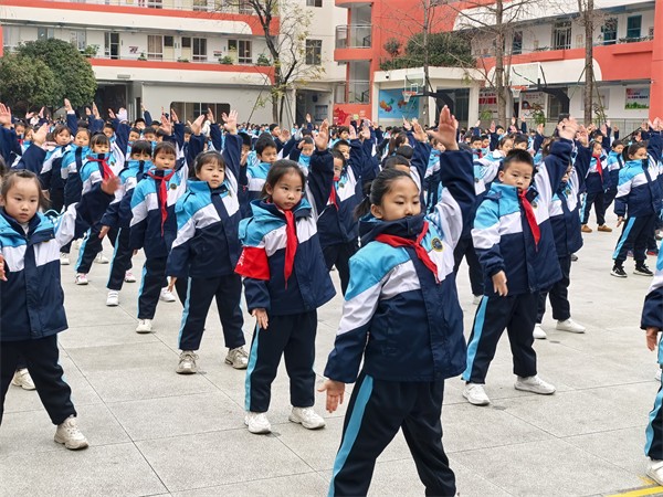 “一二三四,五六七八……”口令声清脆响亮,回荡在整个操场。伸展、扩胸、踢腿、弯腰,每一个动作都标准规范、刚劲有力;抬手、转身、跳跃、落下,每一个节拍都精准卡点、整齐划一。阳光下,同学们的身姿挺拔如松,眼神中闪烁着自信的光芒,稚嫩的脸庞上写满了认真与执着。小学低年级同学动作虽略显稚嫩,却充满童真与活力;小学高年级同学则尽显沉稳与大气,动作舒展流畅,将广播操的韵律美与力量感完美融合。整齐的队列如同流动的画卷,标准的动作恰似跳动的音符,展现出“根生少年”团结协作、奋勇争先的精神品质。