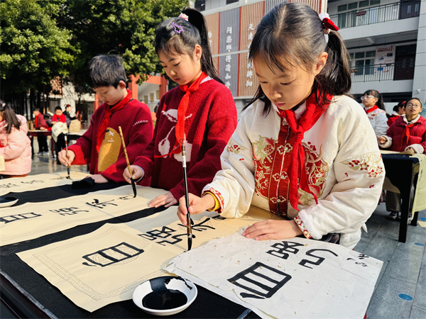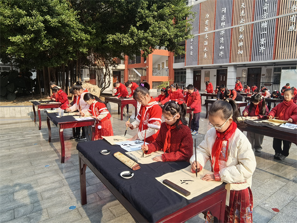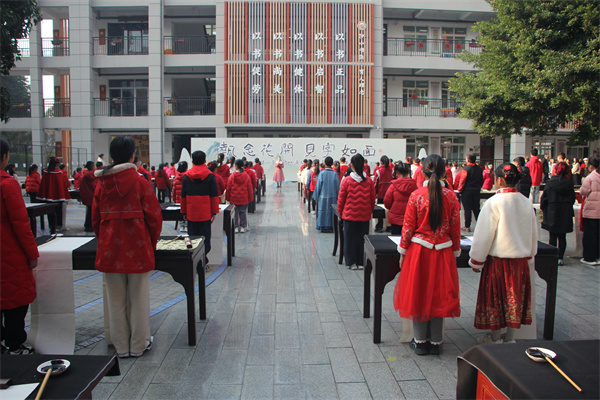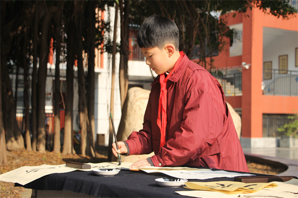 学校中庭百人齐聚,各年级书法佼佼者在此挥毫。书写内容分层设计,贯穿立德树人与文化传承:低年级书写“尚美”“向善”,在简单字形中播种美的意识与向善的品格;中年级书写“自强不息”“少年报国”,以四字词语凝聚精神气韵;高年级书写经典诗句,如“只留清气满乾坤”“为有源头活水来”,在诗境与笔墨交融中,体悟传统文化中的高洁品格与求学精神。