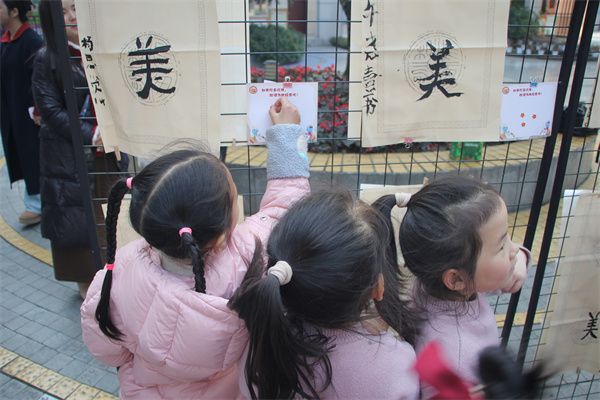 书写环节结束后,一场属于孩子们自己的“品鉴会”自然而然地开始了。各班的小小观摩团手持点赞卡和小红花,穿梭于一幅幅作品之间。他们时而驻足凝视,时而轻声交流:“这个字写得真有力量!”“这一笔的弯转好漂亮。”手中的小红花,被郑重地贴在自己心仪的作品旁。这一刻,他们不仅是书写者,更是欣赏者、评价者,在给予与收获之间,懂得了欣赏,学会了赞美,也在彼此的笔墨中看见了坚持与成长。书法,就这样从纸面走向心灵,从个人修为走向了共情与共享。