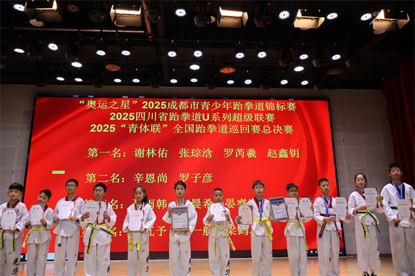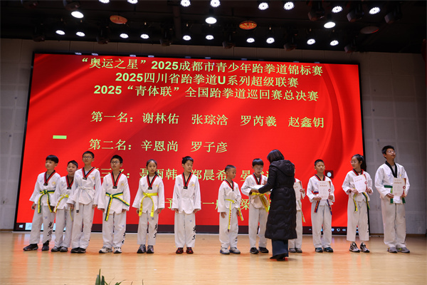 风采展示后,现场举行了颁奖仪式。学校跆拳道队小队员们不畏艰辛、刻苦训练,在“奥运之星”2025成都市青少年跆拳道锦标赛、2025四川省跆拳道U系列超级联赛、2025“青体联”全国跆拳道巡回赛总决赛中奋勇拼搏,斩获4 金、2银、5铜及6个第五名的优异成绩。学校领导为获奖小队员们颁发了奖状和奖牌,鼓励全体同学以他们为榜样,在成长路上勇攀高峰。