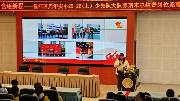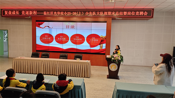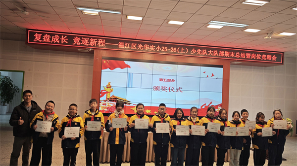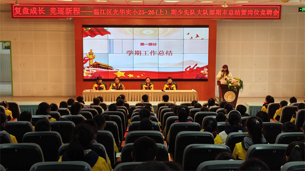 为全面复盘本学期少先队工作,凝聚团队力量,明确下学期工作方向,近日,成都市温江区光华实验小学大队部以“复盘成长,竞逐新程”为主题,召开期末工作总结会。4-6年级全体大队委、少先队国旗班及主持班成员参会,学生发展中心老师全程指导。