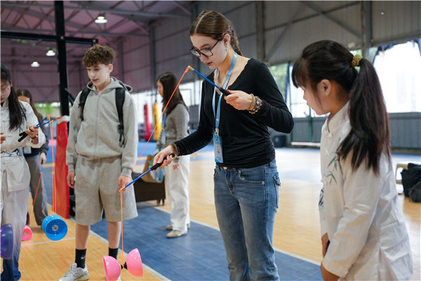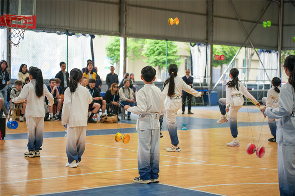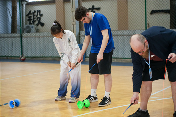 接着,代表团观看了付继建老师与空竹社团带来的空竹表演。小小空竹翻飞灵动,声响清脆,赢得阵阵掌声与喝彩。表演结束后,代表团成员迫不及待地亲身体验。空竹社团的同学们化身文化小使者,耐心展示并讲解动作技巧,在传承传统体育文化的同时,也让法国师生近距离感受到中华非遗的魅力。