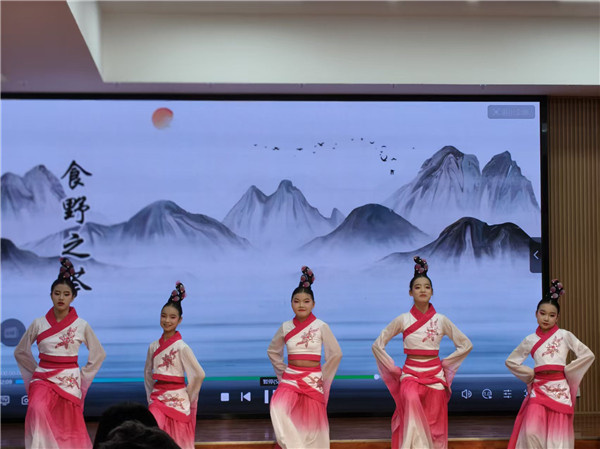 在张天茹主任的指导下,舞蹈社团的同学们翩翩而来,带来《小雅鹿鸣》。“呦呦鹿鸣,食野之苹……”优美的舞姿与古雅的吟唱相融,让代表团在表演中感受中国的诗词文化。赵林、赵诗雨老师携葫芦丝社团深情演绎《美丽的神话》。两位老师演奏投入,姿态优雅,葫芦丝音色婉转悠扬,如诉如慕。古筝社团随后奏响《大鱼》,琴声清澈空灵,如流水般潺潺流淌。两曲交织,余韵绕梁,现场洋溢着浓厚的艺术氛围。