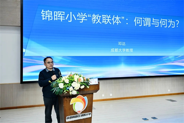 下午,成都大学教授邓达以《锦晖小学教联体,何谓与何为?》为题作专题讲座。邓达围绕学校“教联体”的构建与运行机制展开,提出“四轮驱动·三阶递进·双环嵌套”模型,针对认知、激励、资源、体验四重断层,通过校社协同与家校互动闭环实现协同育人。他以锦晖小学“织锦共育联盟”为例,展示了资源地图、微实践项目、数字化平台等落地成效,为校家社协同育人提供了系统化、可操作的实践路径。