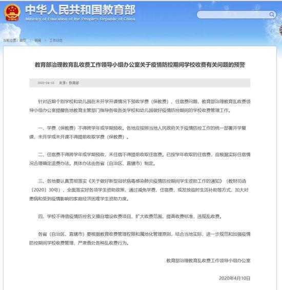 4月10日,教育部对群众关心的“关于疫情期间学校收费”的问题做出如下批示:
