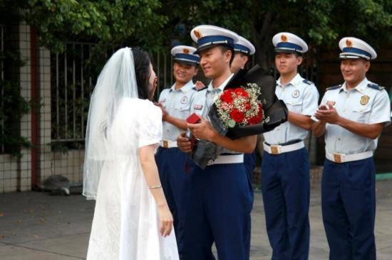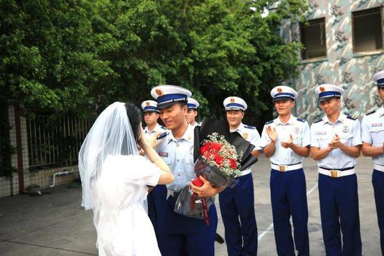 在冷简莹前往男朋友黄永生执勤的消防站的同时,黄永生和队友们正身着火焰蓝在营区内进行队列训练,完全不知情女友即将到来给他惊喜。穿着白裙披着白纱的冷俭莹小心翼翼的走到队列的后面,轻轻地站在黄永生背后。指挥员下达命令“黄永生,向后转!”站在一旁的朋友帮忙递上鲜花,一脸茫然的黄永生转身,披着白纱一身白裙的冷简莹站在自己的面前。