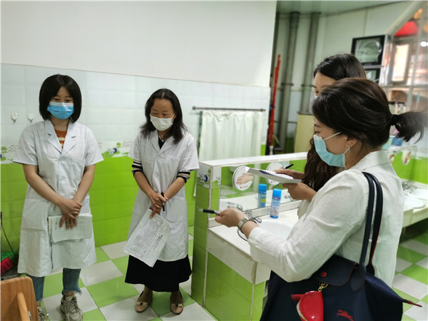 随后,评估小组卫健局成员对幼儿园物资储备、班级准备情况、床位摆放、水龙头数量、隔离室设置等内容进行详细的检查,并随机抽取了教师进行七步洗手法演示。
