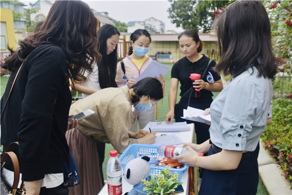 上午九点,老师们陆续到来,扫码入园,进行签到。在园长高静的带领下,老师们参观了幼儿园的户外区域、功能室、班级环境及厨房。
